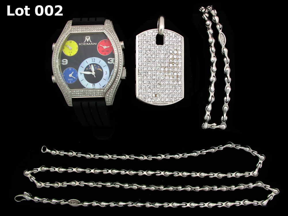 CHAIN: 10kw bicycle link chain necklace; 4.9mm diameter x 30 inches long; CAL tdmk; 74.26 grams. BRACELET: 10kw bicycle link chain bracelet; 4.9mm diameter x 9 inches long; CAL tdmk; 22.61 grams. WATCH: Gents st.steel Iceman brand 4 time zone diamond wrist watch; pave set in the case & bezel 497 rd dias, 0.9mm 1.2mm = est 3.30cttw, Avg/I-K/SI; primary black dial w/ blue, yellow, & red sub-dias, blue mother of pearl around moon phase function; Quartz mvmt; ribbed black polyurethane strap w/ deployant buckle; tonneau shaped case. PENDANT: 10kw 'dog tag' style cubic zirconia pendant; 153 rb cz's, 2.7mm diameter; 2.05 inches tall x 1.3 inches wide x 3.75mm thick; CAL tdmk; 21.78 grams. Eastern District of Louisiana