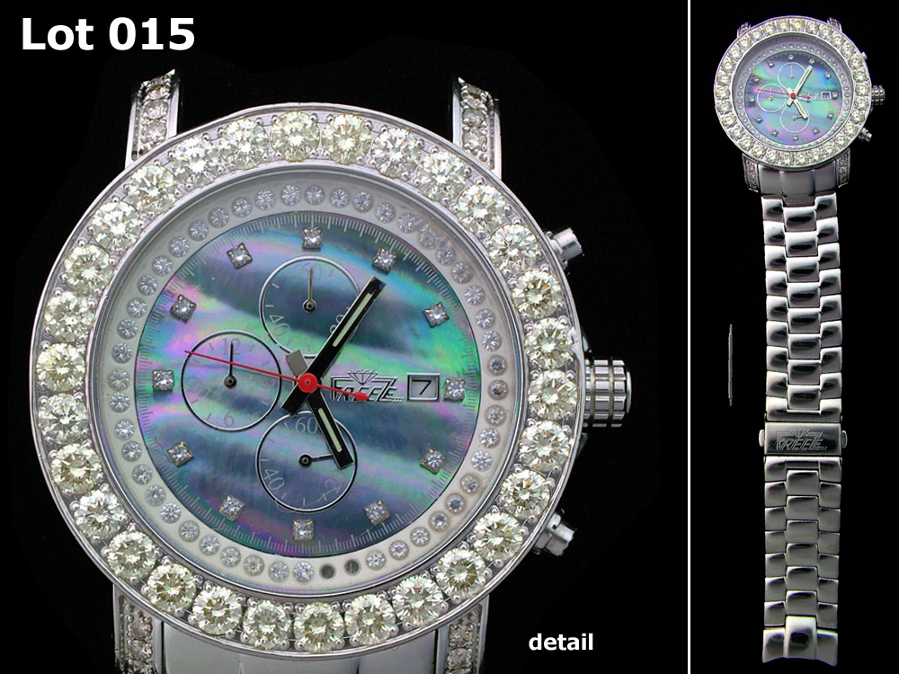 WATCH: Gents st.steel Freeze brand clarity enhanced diamond chronograph wristwatch; blue MOP rhinestone dial & sub-dials (3); screw off bezel w/ 30 rb dias, 4.2mm = est 7.50cttw, V.Good/V-X/I1-I2/clarity enhanced; lugs w/ 12 rb dias, 2.2mm = est 0.48cttw, Fair/Q-S/I1-I2; st.steel link bracelet; Serial F3309. Eastern District of Louisiana