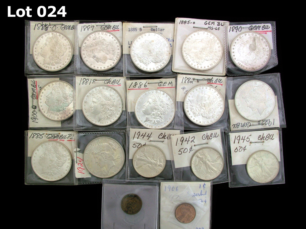COIN: 1882-S US Morgan silver dollar.;COIN: 1881 US Morgan silver dollar.;COIN: 1922-D US Peace silver dollar.;COIN: 1886 US Morgan silver dollar.;COIN: 1887 US Morgan silver dollar.;COIN: 1888-O US Morgan silver dollar.;COIN: 1885-O US Morgan silver dollar.;COIN: 1900-O US Morgan silver dollar.;COIN: 1885-O US Morgan silver dollar.;COIN: 1890 US Morgan silver dollar.;COIN: 1885 US Morgan silver dollar.;COIN: 1906 US cent.;COIN: 1945 US Walking Liberty silver half dollar.;COIN: 1942 US Walking Liberty silver half dollar.;COIN: 1924 US Peace silver dollar.;COIN: 1944 US Walking Liberty silver half dollar.;COIN: 1892 US one cent. District of Massachusetts