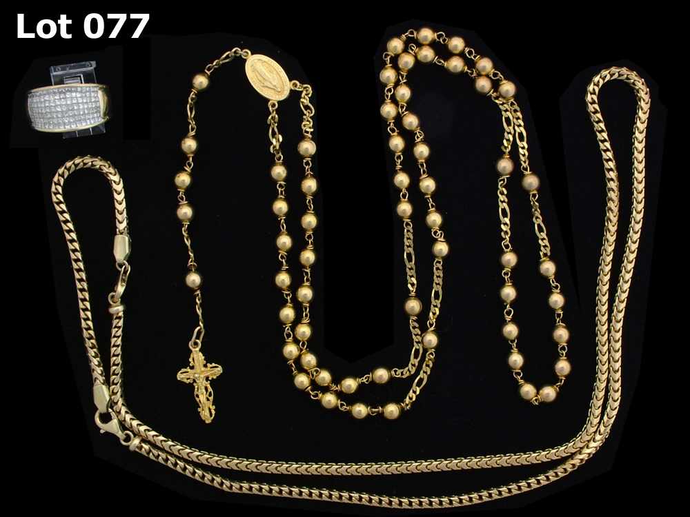NECKLACE: [1] 14KYG foxtail chain necklace (24 in. + 6 in.); 68.0 grams. ROSARY: [1] 14KYG rosary; 46.1 grams. RING: [1 14KYG ring set with 112 princess cut dia.s, TWA 3.50 cts, J-L, SI1-2, size 9.5; 15.4 grams.