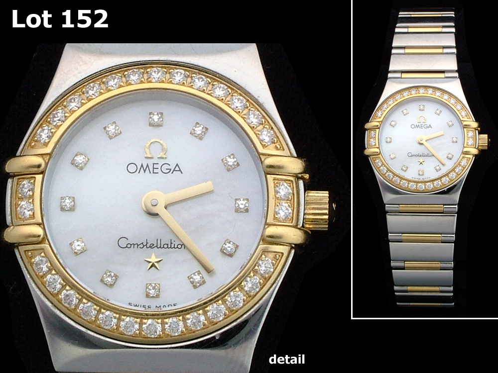 WATCH: [1] stainless steel & 18KYG lades Omega Constellation 'My Choice' watch with mother-of-pearl dial with dia markers, bezel set with 30 rbc dia.s, TWA 0.30 cts, G, VS2, #59401337.