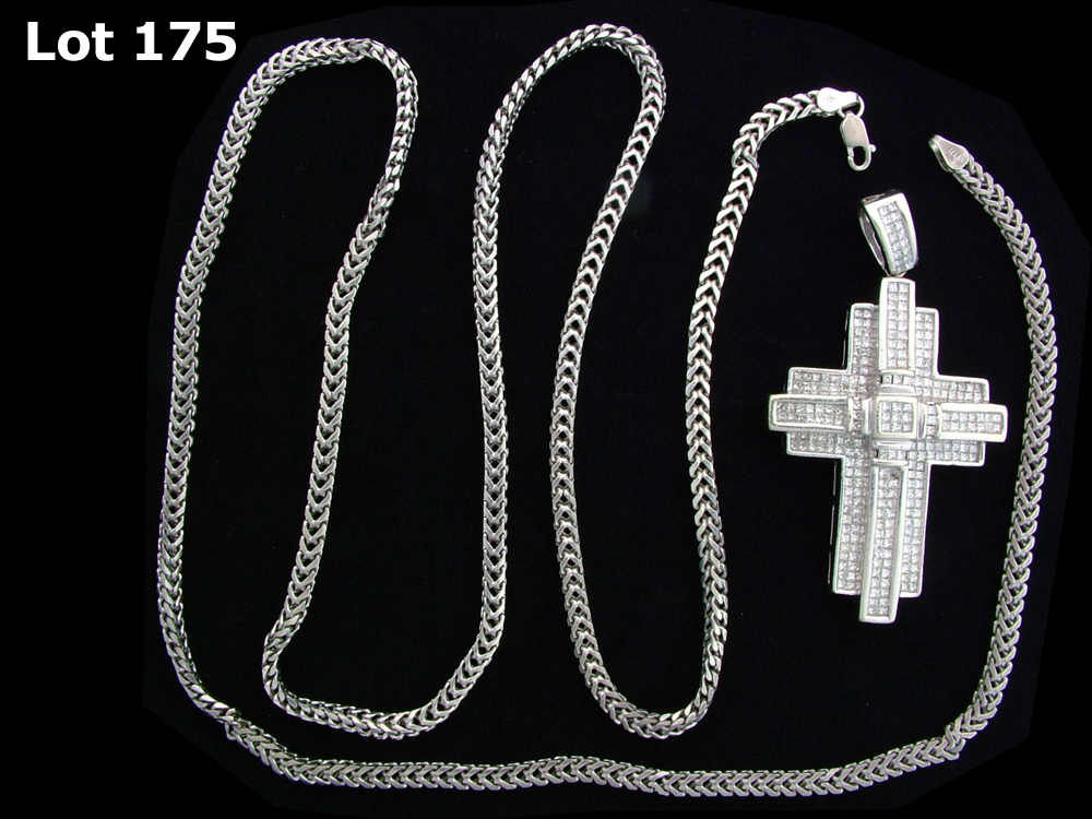 PENDANT: Gents 14kw 'invisible' set diamond cross pendant; 261 sq prin dias, 1.7mm = 8.09cttw, Good/L-N/SI1-I1/few chipped; 2.4 inches tall x 1.75 inches wide x 11.24mm deep; 64.87 grams. CHAIN: Gents st.silver Anaconda link chain necklace; 4.40mm x 3.08mm x 40.5 inches long; Italy; 58.99 grams. Eastern District of Missouri