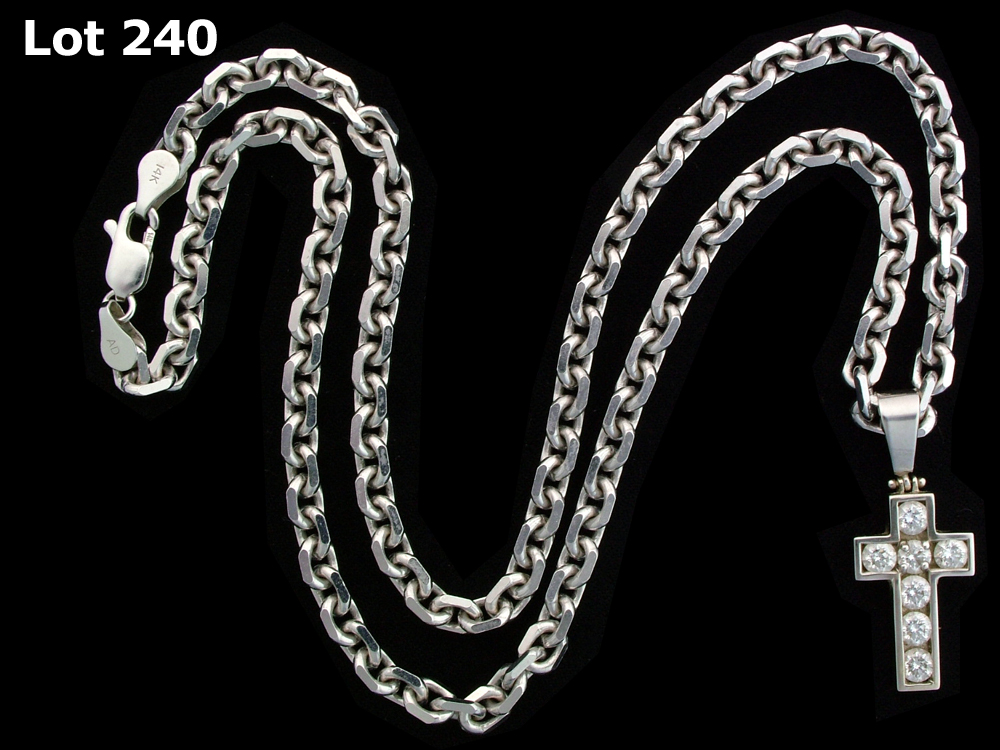 NECKLACE & PENDANT: [1] 14KWG link necklace (19.25 in.) with 14KWG cross pendant set with 7 round cut dia.s TWA 1.68 cts I/J SI2-I1; 45.5 grams.