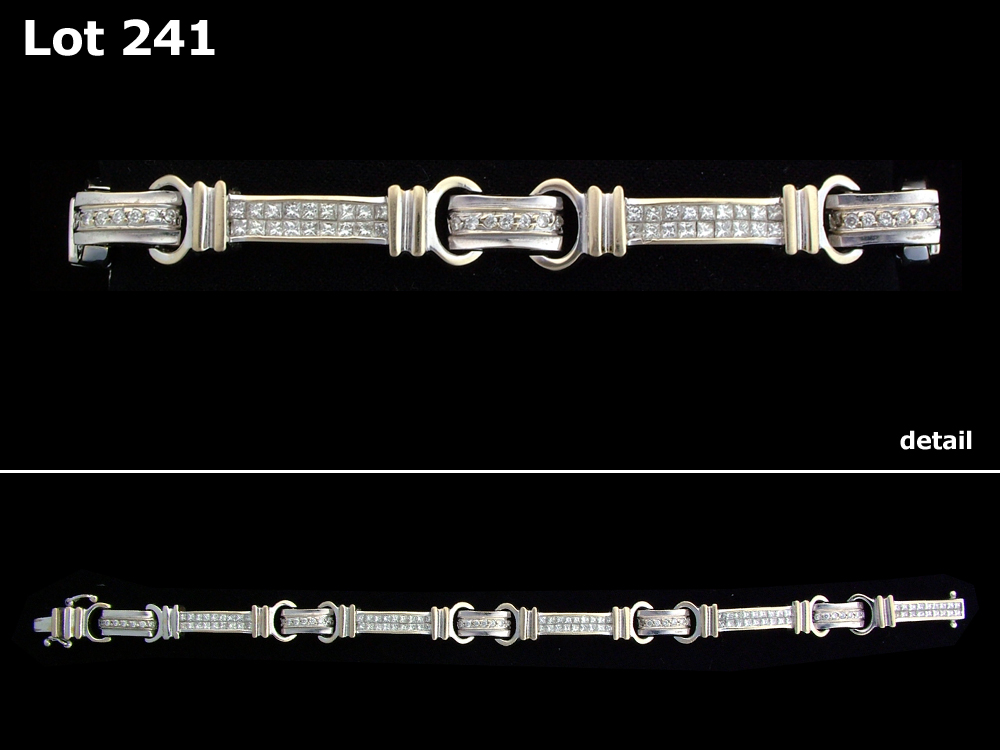 BRACELET: [1] 18KWG & YG link bracelet set with 90 princess cut dia.s TWA 4.50 cts & 35 round cut dia.s TWA 0.35 cts H/I SI1-2; 44.9 grams.