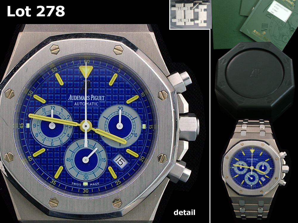 WATCH: [1] titanium Audemars Piguet 'City of Sails' Royal Oak limited edition (300 pieces) watch with blue dial, chrono, date, yellow markers, 3 extra links, #E-28867, with box & books; circa 2000.