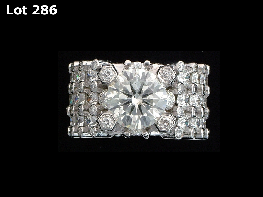 RING: Gents 14kw round brilliant diamond ring; 1 (ctr) rb dia, 10.28mm x 10.28mm x 6.10mm = est 4.00 carats, Good/K/I1; 55 rb dias, 3.4mm to 3.5mm = est 8.52cttw, V.Good/H-J/SI2-I1; 148 rb dias, 1.2mm to 1.4mm = est 1.45cttw, V.Good/H-J/SI1-I1; eternity motif; 23.63 grams. Northern District of Illinois