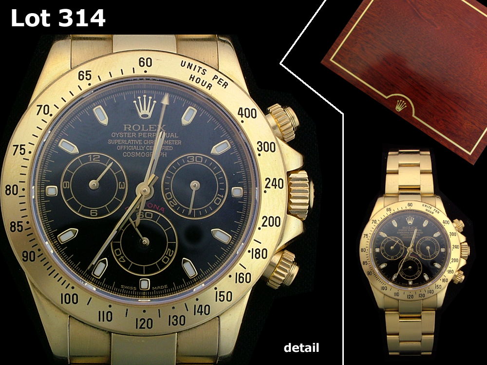 WATCH: [1 18KWG Rolex Daytona watch with black dial with goldtone accents, oyster bracelet (box, polishing cloth, tags, books & papers included); model #116528, serial #Y963974, movement model #4130, movement serial #C 0107140, caseback #2118, clasp #CL3 78498, band #AD 78498. Eastern District of North Carolina