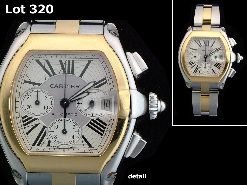 WATCH: [1 stainless steel & 18KYG Cartier Roadster gents automatic watch with white & silvertone dial with black Roman markers, date, chrono, #721732CE, 2618.