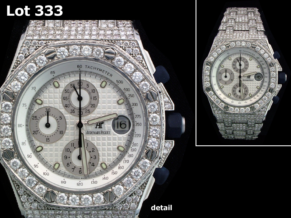 WRISTWATCH: Gents st.steel Audemars Piguet Royal Oak Offshore chronograph wristwatch w/ aftermarket pave diamond case, bezel, & bracelet; 32 rb dias, 2.6mm to 2.7mm = est 2.08cttw, Good/I-K/SI2-I2; 992 rb dias, 1.5mm to 1.6mm = est 15.80cttw, Good/I-K/SI2-I2; silver textured dial; date at 3 o'clock position; Automatic mvmt; Serial No 3662; Model F07587. District of South Carolina