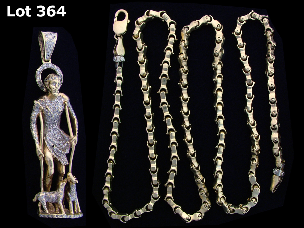 CHAIN: [1 14KYG fancy link chain necklace, 39 inches long; 170.5 grams,,,. PENDANT: [1 10KYG large pendant of Lazarus with Dogs is set with diamonds, J to L, I-1 to I-3, TWA 2.0 cts.; 141.5 grams; 2 diamonds are missing.