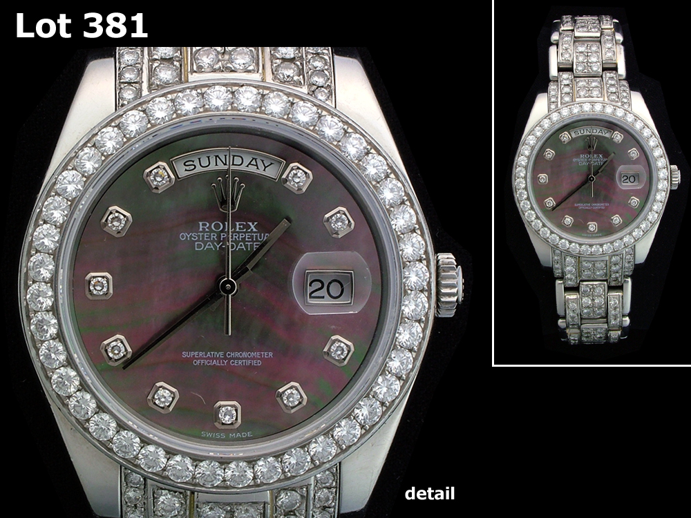 ROLEX: Gents 950 platinum Rolex O.P. Day Date Pearlmaster diamond wristwatch w/ factory MasterPiece link bracelet capped aftermarket w/ diamonds; black mother-of-pearl dial serti set w/ 10 rb dias, 1.6mm = est 0.16cttw, EX/F/VVS; bezel bead set w/ 40 rb dias, 2.6mm = est 2.40cttw, EX/F-G/VVS; bracelet w/ 195 rb dias, 2.3mm to 2.4mm = est 9.36cttw, Fair/G-I/SI1; Model 18946; Mvmt 7753757 (3155); Serial A626033 (1999). Northern District of Indiana