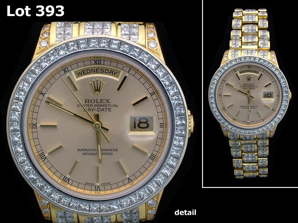 WATCH: [1 18KYG Rolex Oyster Perpetual Day-Date watch with champagne dial with baton markers, aftermarket bezel, band, lugs & clasp set with princess cut dia.s (all aftermarket), TWA 24.00 cts, G, VS1-2; model #118238, serial #F618233, movement model #3155, movement serial #3 9550536, clasp #CL7, 83208, caseback #2098. Middle District of Georgia