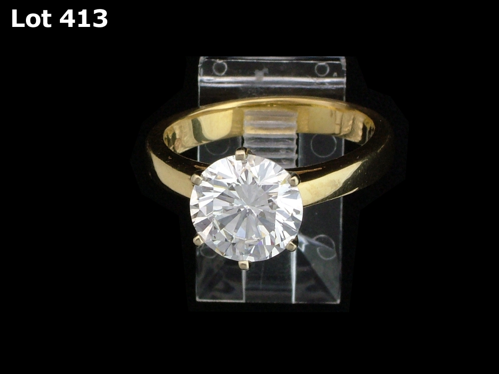 RING: Ladys 18ky&plat diamond solitaire engagement ring; 1 round brilliant diamond, 9.43mm to 9.46mm diameter, and approx. 5.58mm deep, weighing an estimated 3.03 carats; Cut- Very Good make, 59.1% table; Color- H Range; Clarity- SI1; MJC tdmk; 7.08 grams. Middle District of Florida