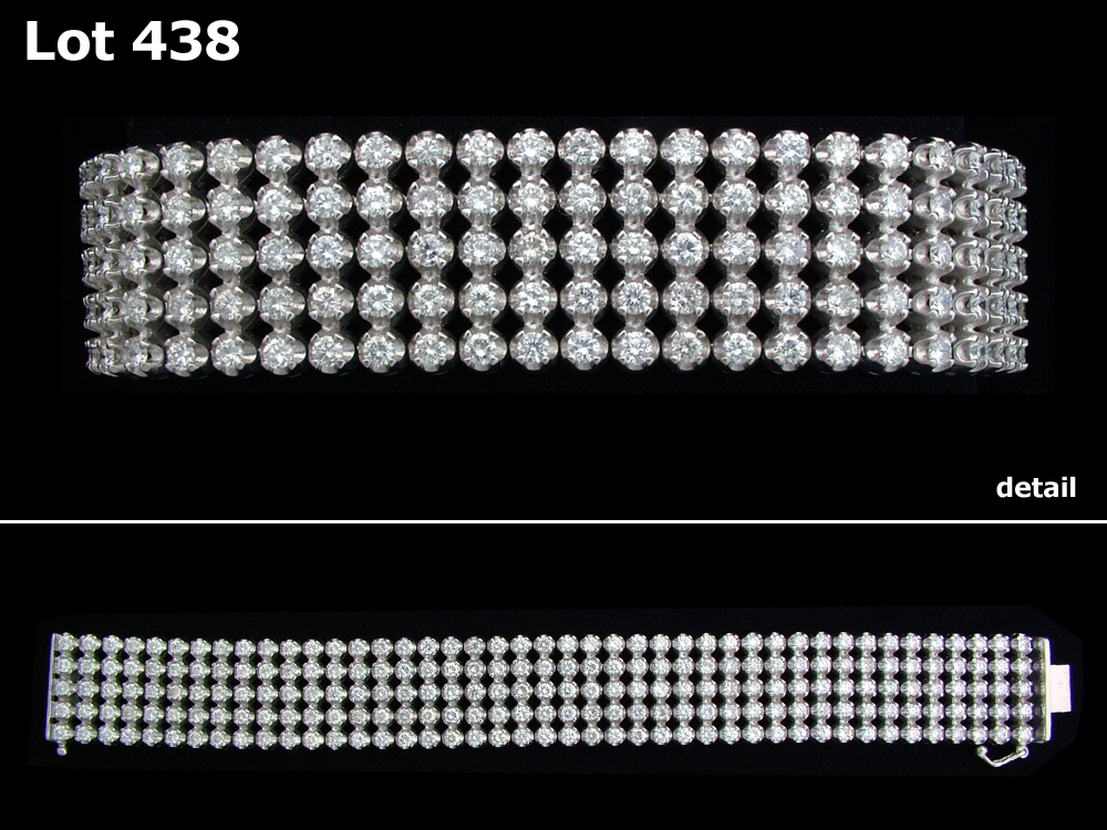 BRACELET: Gents 10kw diamond link bracelet, five row motif, four prong illusion stgs; 215 rb dias, 2.9mm = est 19.35cttw, Fair/H-K/SI2-I2; 23.73mmW x 4.63mmT x 8.3 inches long; 95.48 grams.