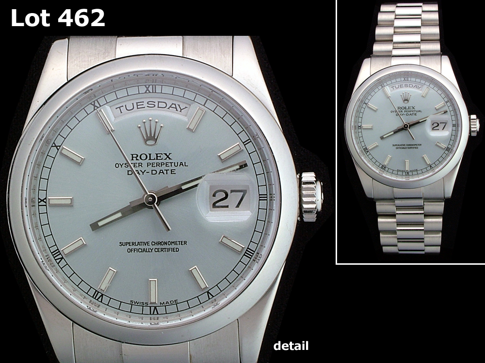 ROLEX: Gents 950 platinum Rolex O.P. Day Date wristwatch; ice blue dial; polished dome bezel; President link bracelet with hidden clasp (83206); Model 118206; Mvmt 3 1352900 (3155); Serial Z287403 (2006 1/2).