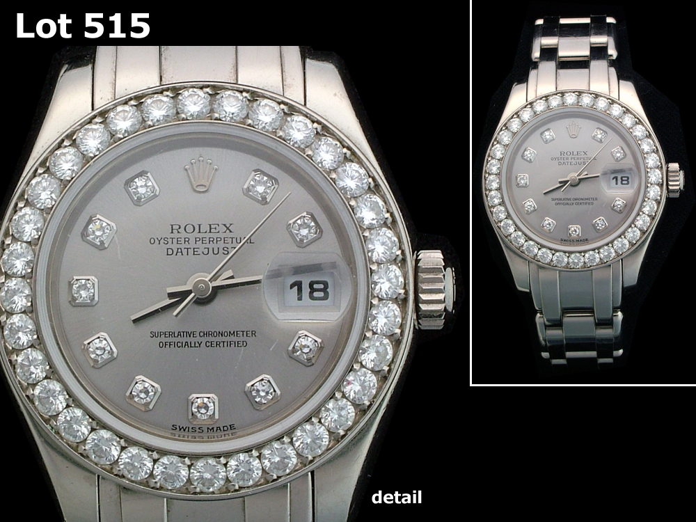ROLEX: Ladys 18kw Rolex Oyster Perpetual Datejust Pearlmaster (Masterpiece) wrist watch; silver colored dial w/ 10 rd dias, 1.5mm = est 0.15cttw, Excellent/F/VVS; bezel set w/ 32 rb dias, 2.4mm = est 1.60cttw, Excellent/F/VVS; Masterpiece link bracelet (72949 AD1); Model 80299; Mvmt A 1023680 (2235); Serial P195822 (2001). Note: Short bracelet length (6.25 inches). Eastern District of Michigan