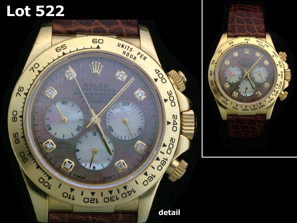 WATCH: [1 18KYG Rolex Daytona watch with brown leather bracelet with 18KYG clasp, pink/red mother-of-pearl dial with 8 dia. Markers; model #16518, serial #A811328, movement model #4030, movement serial #203315, case back #16500, clasp #16518.