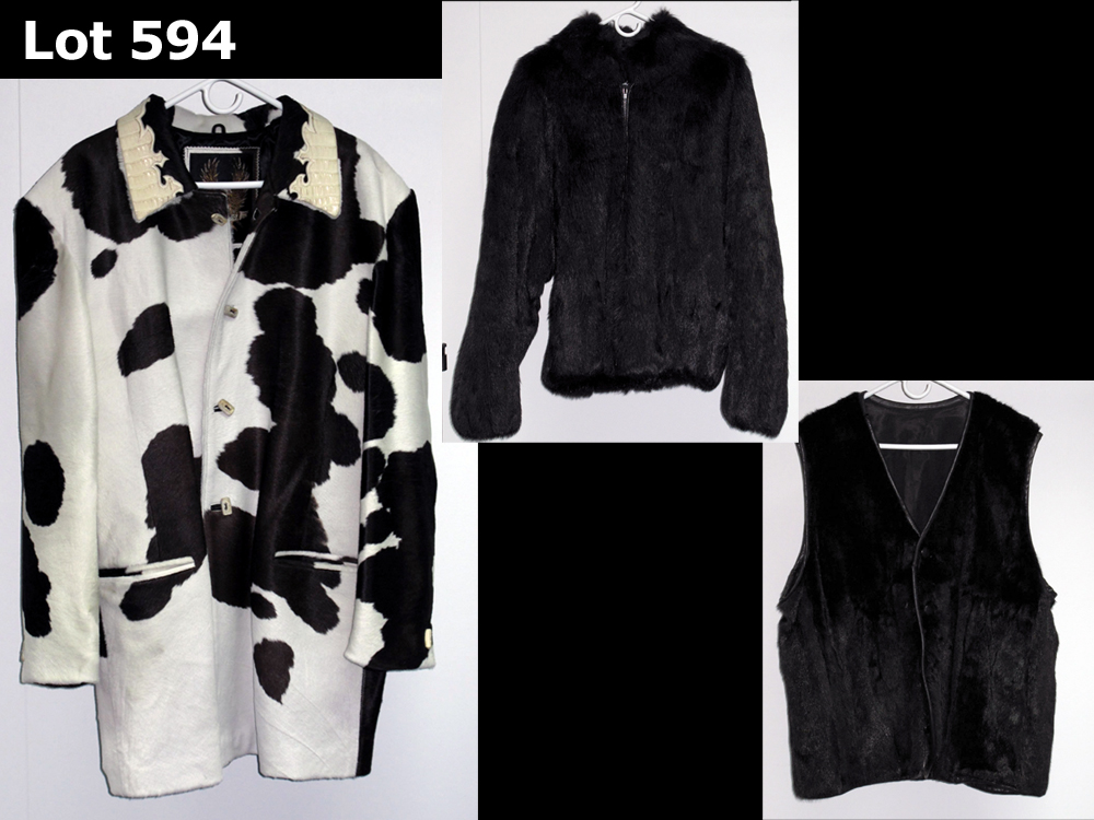FUR: Gents black pahmi fur bomber style jacket; zipper front; elastic sleeves & base; black leather trim at zipper; Franco the Furrier label, Hong Kong; 'Pahmi Mink', 'Guarantee of Quality; size 40. FUR: Gents spotted cow leather (fur) coat; winged collar w/ stitched white crocodile trim; rectangular bone buttons; dk brown satin lining; 3XL size, 37 inches long; Volcano brand, assembled in Mexico. FUR: Gents black mink vest; black leather trim & buttons; KTT monogram; XL size; no maker label. Northern District of Ohio
