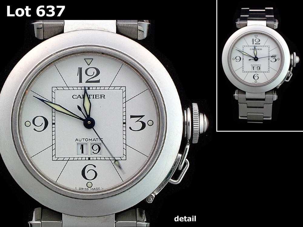 WATCH: [1] stainless steel Pasha de Cartier automatic watch with white dial with date, 4 Arabic markers, steel link band, #204802PB, (with inner & outer boxes, books).