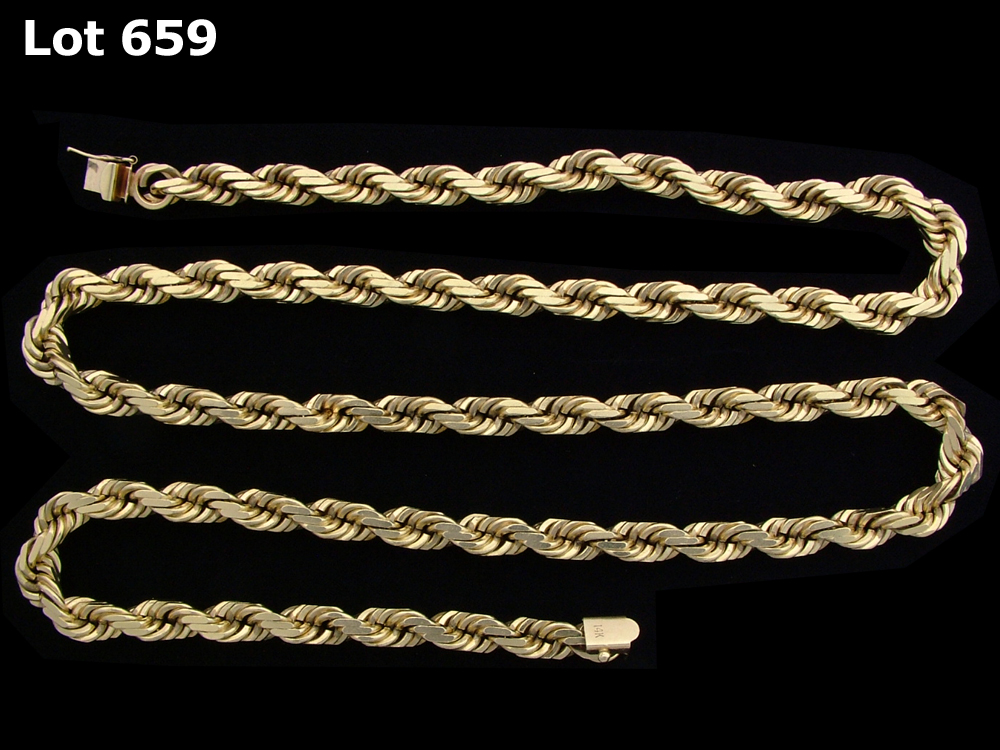 CHAIN: Gents 14ky 'diamond-cut' rope link chain necklace; 6.43mm diameter x 31 inches long; 154.84 grams.
