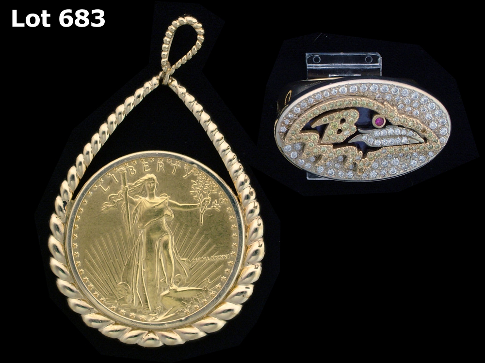 PENDANT: Ladys 14kt yellow gold coin pendant; 1986 US 50 dollar gold piece (1 ounce 999AU); ribbed (shrimp) motif, drop shape; 42.72 grams. RING: 14ky&w Baltimore Ravens logo yellow & white diamond ring; white oval top pave set; 76 rb dias, 0.9mm to 1.4mm = est 0.61cttw, Good/G-I/VS1-SI1; raven set w/ 63 yellow rb dias, 0.9mm to 1.2mm = est 0.44cttw, Good/ltYellows/SI1-I1/one missing; 1 rd ruby (eye), 1.5mm = est 0.02ct; Lombardi Trophy & XXXV logo on sides; inside engraved 'World Champions'; 29.81 grams. Eastern District of Kentucky