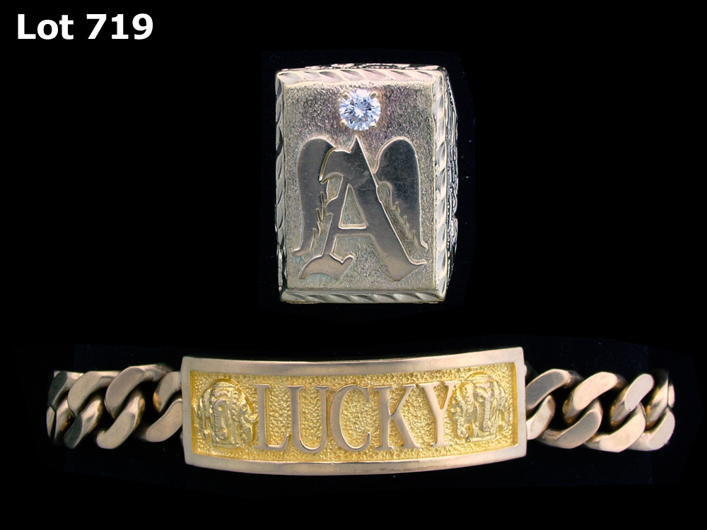 BRACELET: Gents 18ky ID type link chain bracelet; LUCKY on center plate; attached curb link chain, 11.57mm wide x 3.56mm thick x 7.6 inches long; 94.73 grams. RING: Gents 14ky initial 'A' diamond ring; rectangular shaped top; 1 rb dia, 4.90mm to 4.93mm x 3.07mm = est 0.45ct, Good/H/VS; nugget finished sides; 28.25 grams. District of Oregon