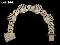 BRACELET: Gents 14ky diamond link bracelet; five crown motif equally spaced between curb link chain; 281 rb dias, 1.3mm to 1.5mm = est 3.54cttw, Fair/G-K/I1-I2; 16.18mmW x 5.71mmD x 8.5 inches long; 188.68 grams.