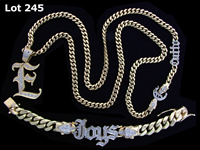 BRACELET: Gents 14ky ID type name 'Joys' diamond bracelet; attached curb link chain w/ twin panther heads; 55 rb dias, 1.2mm to 1.3mm = est 0.55cttw, Fair/I-L/I2; 12.18mmW x 5.19mmD x 7.6 inches long; 90.93 grams. CHAIN: Gents 10ky curb link chain necklace w/ attached name 'Cutto' near leopard head & 'C' clasp; 37 rb diamonds, 1.2mm = est 0.35cttw, Fair-Poor/K-N/I2-I3; PENDANT: Gents 10ky letter 'E' diamond pendant; 33 rb dias, 1.3mm = est 0.33cttw, Fair-Poor/K-N/I2-I3/one missing; 36.51mmT x 30.19mmW x 5.59mmD; 112.33 grams.