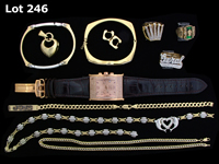EARRINGS: Ladys 14ky loop earrings w/ attached st.silver 'Joys'; 4.54mm tubes x 40.18mm outside diameter; 7.73 grams. BRACELET: Ladys 10ky,w,&r dogwood flower motif link bracelet (hollow); 7.75 inches long; 8.13 grams. Note: dents present. BRACELET: Ladys 10ky&w dolphin & heart motif cubic zirconia link bracelet; 16 rb cz's, 1.7mm; ALI tdmk; 7.5 inches long; 8.11 grams. BRACELET: Ladys 10ky ID type bismarck link chain bracelet; twin chains; 6.5 inches long; ASK tdmk; 6.69 grams. BRACELET: Ladys 14ky bismarck link chain bracelet; 5 equally spaced 'X' stations; 3.4mmW x 1.1mmD x 7 inches long; 4.35 grams. EARRINGS: Pair ladys 14ky half round loop earrings (hollow); partially rhodium plated; 'diamond-cut' finish; 7.88mm wide x 2.49mm thick x 19.92mm outside diameter; PGDA, Turkey tdmk; 3.78 grams. CHAIN: Ladys 10ky,w,&r fancy link chain necklace w/ little girl pendant; 2.66mm x 0.94mm x 16 inches long; 5.16 grams. EARRINGS: Pair ladys 14ky,w,&r loop earrings; 5.96mm wide x 17.04mm outside diameter; 2.83 grams. BRACELET: Ladys 10ky bismarck link chain bracelet; 6.0mm wide x 1.07mm thick x 7 inches long; 3.80 grams. BRACELET: Ladys 10ky&w fancy hollow link chain bracelet; ALI tdmk; 7.0 inches long; 3.57 grams. Note: dents present. EARRINGS: Pair ladys 14ky,w,&r loop earrings; 3 intertwinned tubes; 10mm outside diameter; Italy; 1.98 grams. EARRINGS: Ladys 14ky initial 'G' diamond earrings; script motif; 14 rb dias, 1.1mm to 1.2mm = est 0.10cttw, Fair/K-N/I1-I2; 7.64mm tall; 1.15 grams. SCRAP: Ladys 14ky single smashed tube loop earring; 1.96 grams. PENDANT: Ladys 12ky 'Yami' name pendant; chain missing; 1.79 grams. EARRINGS: Ladys 10ky&w twisted tube loop earrings; 2.5mm (each tube) x 21.21mm outside diameter; 2.11 grams. BRACELET: Ladys 10ky ID type bismarck link chain bracelet; marquise shaped ctr plate; 2.55mm wide x 0.95mm thick x 5.5 inches long; 2.24 grams. SINGLE EARRING: Ladys 14ky tube loop earring; partially rhodium plated; 2.24mm diameter x 24.8mm outside diameter; 0.96 grams. SINGLE EARRING: Ladys 10ky cubic zirconia earring; 4 rb cz's, 2.3mm; 1.68 grams. SINGLE EARRING: Ladys 14ky single 'huggie' style loop earring; 5.09mm wide x 15.16mm outside diameter; 0.88 grams. COSTUME: Seven (7) white plated imitation stone bead rings; 16 beads dangling on each; split shanks. COSTUME: Ladys yellow, white, & rose plated Dior brand necklace; multiple leaf motif. SINGLE EARRING: Ladys 14ky single synthetic opal inlaid loop earring; 2.26mm wide x 11.12mm outside diameter; 0.73 grams. SINGLE EARRING: Ladys 10ky loop earring w/ attached st.silver 'Geriash'; 2.82mm tube x 25.14mm outside diameter; ALI tdmk; 1.53 grams. PENDANT: Ladys 18ky boy motif enamel pendant; blue color enamel; 12mm tall; CDR tdmk; 0.48 grams. SINGLE EARRING: Ladys 14ky&w single dangle earring; 0.43 grams. COSTUME: Ladys white plated rhinestone link necklace. COSTUME: Ladys yellow plated rhinestone link necklace. SINGLE EARRING: Ladys 14ky half bead earring; faceted finish; hollow; 7.23mm; 0.28 grams. COSTUME: Ladys yellow plated rhinestone link bracelet; 4 rows across; 6.8 inches long. EARRINGS: Pair ladys brown colored base metal earstuds; 5.15mm diameter. COSTUME: Ladys white plated rhinestone link bracelet; 2 rows across; 7 inches long. COSTUME: Two (2) white plated dome wave motif rhinestone rings; pink & blue enamel. SINGLE EARRING: Ladys st.silver bear motif earring; 15mmT x 10.8mmW x 2.42mmD; 0.86 grams. RING: Ladys st.silver cubic zirconia ring; 15 sq prin cz's, 4.0mm; 8.83 grams. RING: Ladys st.silver cubic zirconia ring; 7 rb cz's, 3.0mm; 6.97 grams. WATCH: Ladys yellow plated Generic brand rhinestone watch; round case, link bracelet; Serial F0105780. COSTUME: Ladys yellow, white, & rose plated Dior brand dangle rhinestone earrings; leaf motif. COSTUME: Pair ladys white plated rhinestone earrings. COSTUME: Ladys white plated sitting cat motif rhinestone pendant; 2.5 inches tall. SINGLE EARRING: Ladys st.silver cubic zirconia stud earring; 1 rb cz, 8.0mm; 1.04 grams. COSTUME: Ladys single white plated rhinestone stud earring. COSTUME: Ladys single white plated rhinestone stud earring; 4.0mm round. COSTUME: Ladys white plated ring.