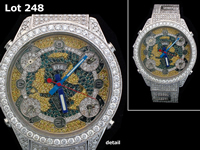 WATCH: Gents st.steel Jacob & Co. Five Time Zone wristwatch w/ after-market diamond appointments & JC link bracelet; screw off bezel top factory bead set w/ 52 rb dias, 2.5mm = est 2.86cttw, Good/H-K/SI; bezel sides aftmkt w/ 288 rd dias, 1.0mm = est 1.45cttw, Fair/H-K/SI1-I1; case pave set w/ 126 rb dias, 1.7mm = est 2.52cttw, Fair/J-K/I2; st.steel bracelet bead set w/ 710 rb dias, 1.7mm = est 14.20cttw, Fair-Poor/I-L/I2-I3; world map motif afmkt dial pave set w/ irradiated green, yellow, & white diamonds; 120 bright yellow rb dias, 1.2mm to 1.3mm = est 1.20cttw, Fair/BrightYellow/I1-I2; 135 deep blueish Green dias, 1.2mm to 1.3mm = est 1.35cttw, Fair/deepBLgreen/I1-I2; 140 rb dias, 1.2mm to 1.3mm = est 1.40cttw, Fair/H-K/I1-I2; 5 ETA quartz mvmts; no serial number. Note: total diamond weight approx. 24.98cts.