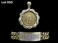 PENDANT: [1 14KYG pendant set with 15 rbc dia.s, TWA 0.75 cts, tapered baguette cut dia.s, TWA 1.80 cts, J/K, SI2-I1, and one 1 oz. $50 Liberty gold coin; 58.5 grams,,. BRACELET: [1 14KYG double curb link 'Gregg' ID bracelet (8 in.) set with 25 rbc dia.s, TWA 1.25 cts, H/I, SI2; 95.1 grams.